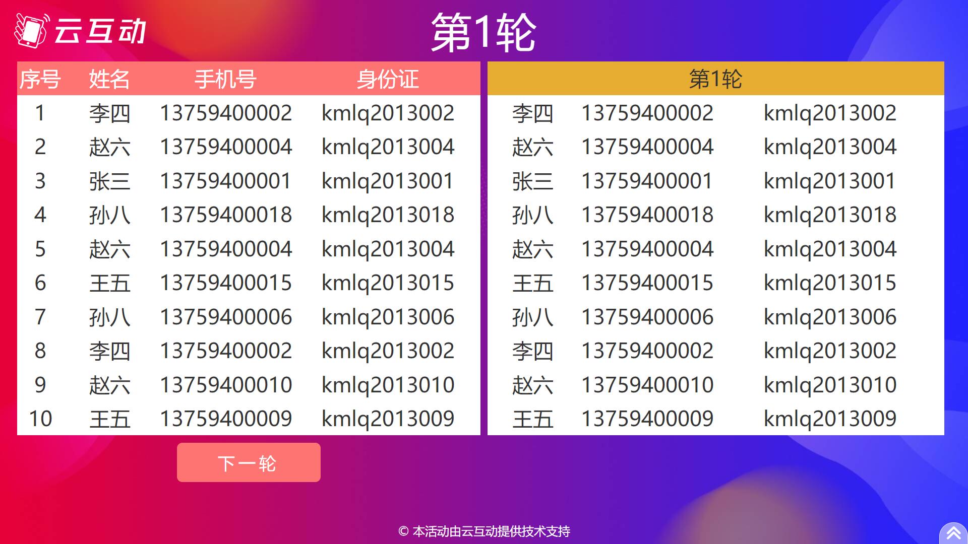 2、號(hào)碼滾動(dòng)抽獎(jiǎng),這種號(hào)碼滾動(dòng)靈活性更強(qiáng),可以是導(dǎo)入的號(hào)碼、手機(jī)號(hào)等,還可以導(dǎo)入多列表單比如:姓名+手機(jī)號(hào)碼,或者身份證號(hào)碼+姓名+其他編號(hào)等,可以在各種滾動(dòng)抽獎(jiǎng)場(chǎng)景中使用。