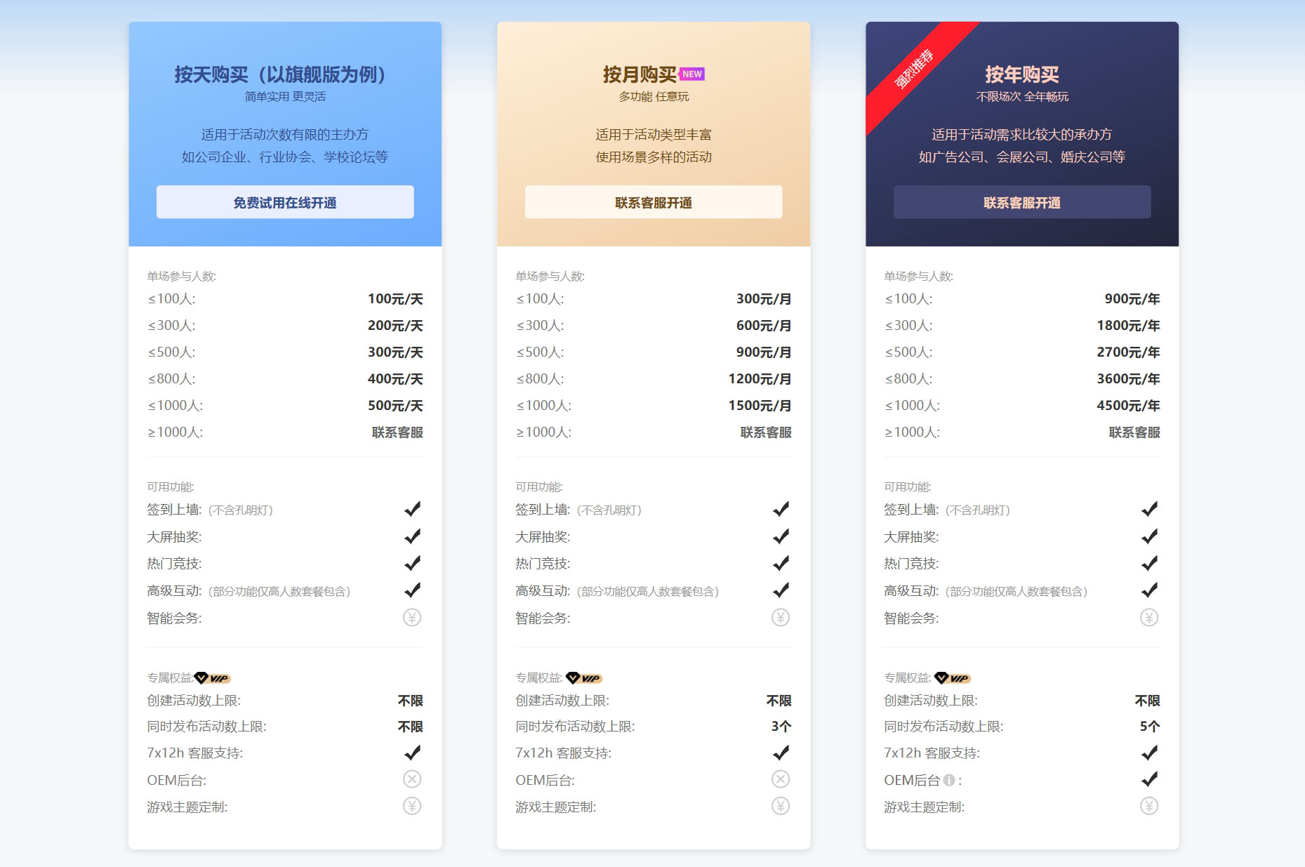 云互動(dòng)系統(tǒng)按次購(gòu)買可以在線直接開通,按月購(gòu)買、按年購(gòu)買需要聯(lián)系客服支付費(fèi)用并手動(dòng)開通活動(dòng)權(quán)限。