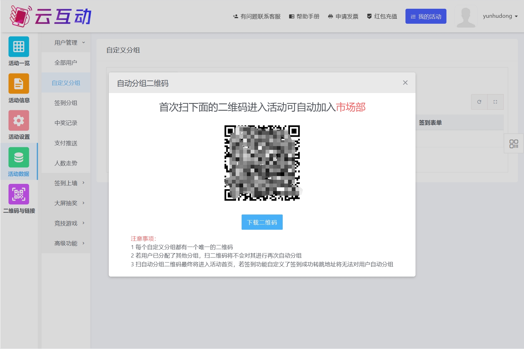 在使用云互動(dòng)系統(tǒng)的過程中,我們發(fā)現(xiàn)常有客戶需要?jiǎng)?chuàng)建多個(gè)部門信息或者分公司信息,而且某些獎(jiǎng)品需要指定從特定的分組中抽取,我們針對此需求,在最新版的云互動(dòng)系統(tǒng)中加入了自定義分組二維碼,可通過掃不同的分組二維碼自動(dòng)分組。