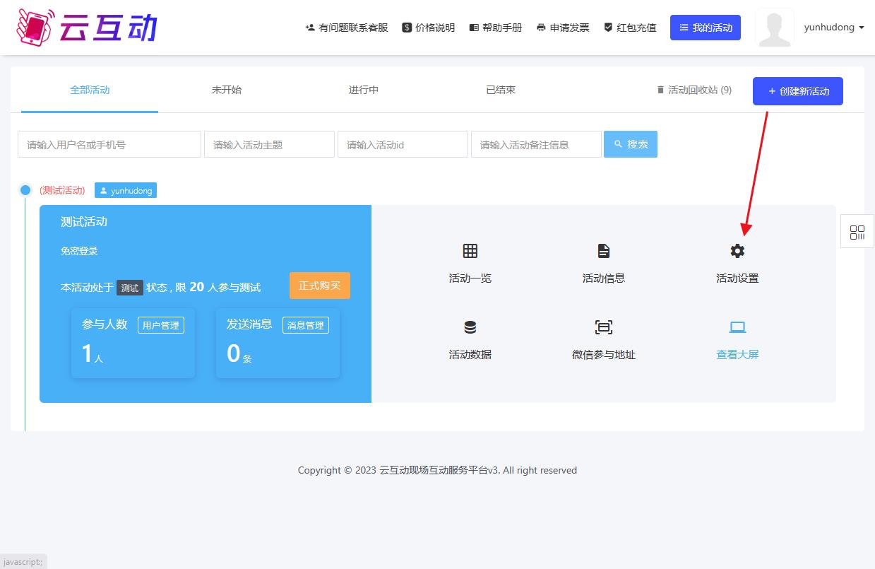 1、在云互動(dòng)系統(tǒng)后臺(tái)創(chuàng)建新活動(dòng)后,進(jìn)入活動(dòng)設(shè)置選項(xiàng)。