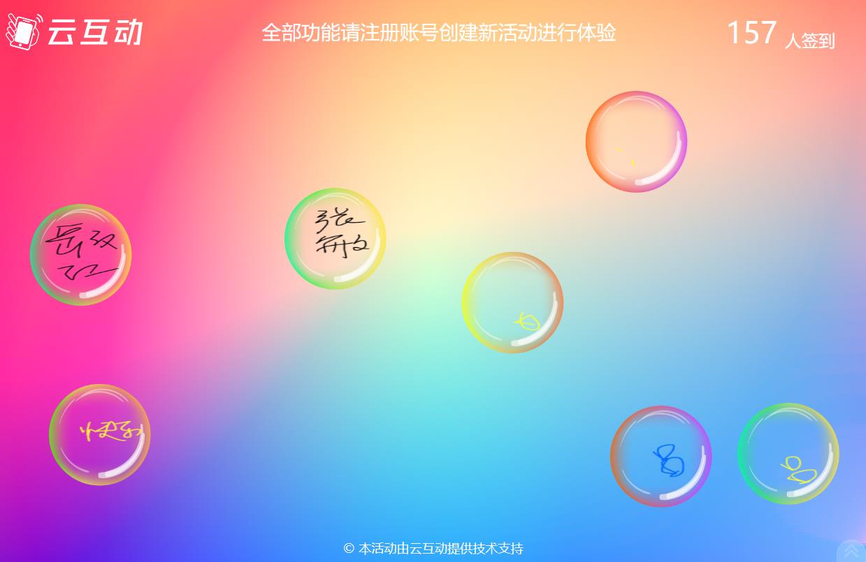 泡泡簽到是云互動(dòng)現(xiàn)場(chǎng)互動(dòng)系統(tǒng)中樣式非常新穎的簽到方式,簽到系統(tǒng)可以調(diào)用微信頭像或者是手寫(xiě)簽名來(lái)在大屏幕上以泡泡的形式顯示出來(lái),好玩又有趣。