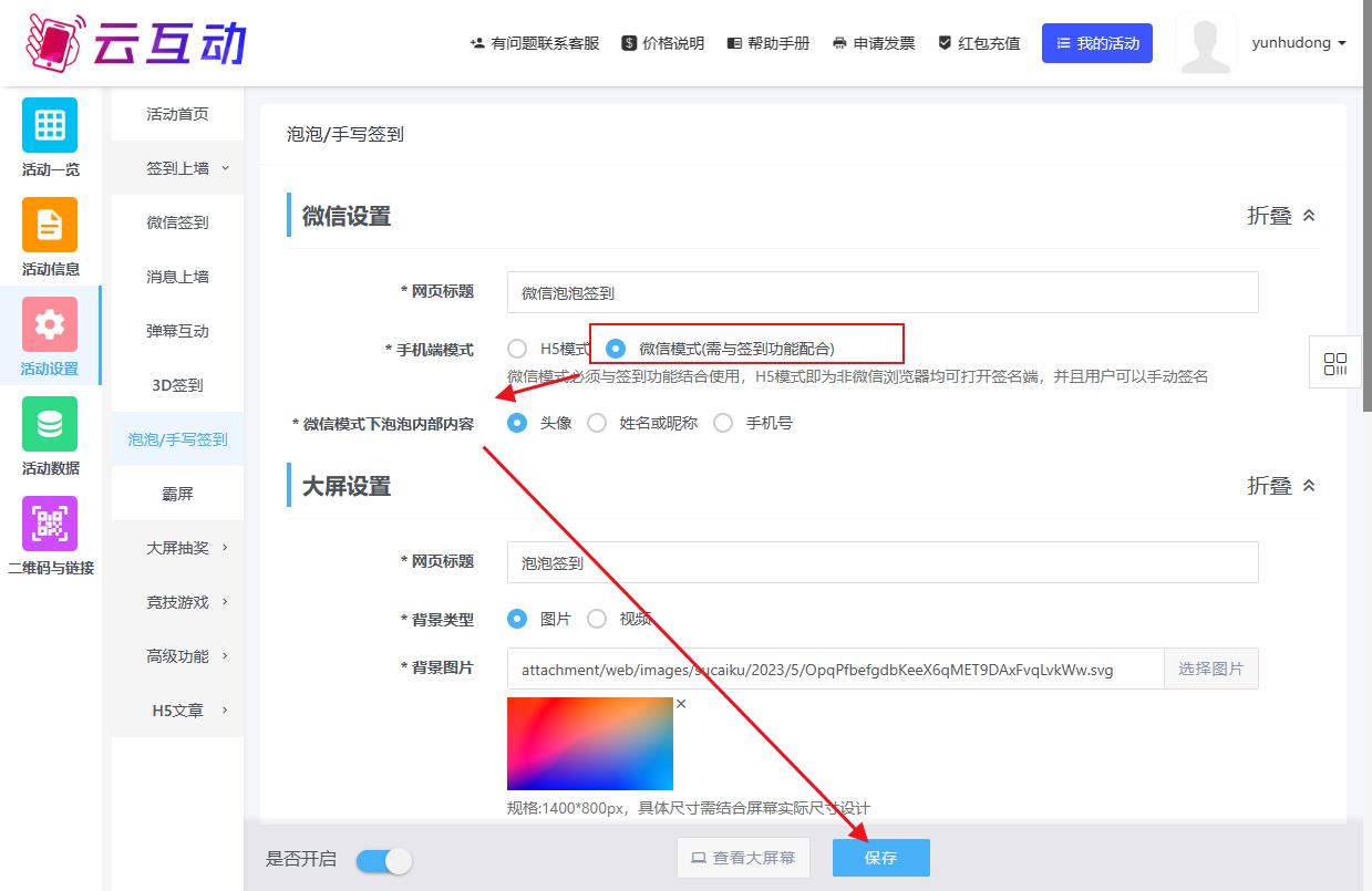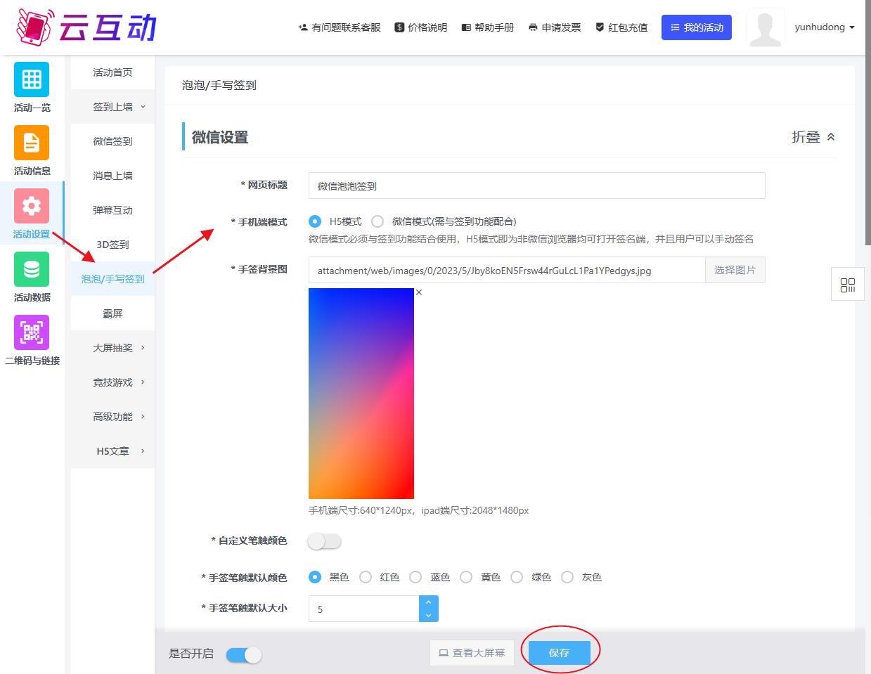 2、在活動(dòng)設(shè)置中找到“簽到上墻”里面的“泡泡/手寫(xiě)簽到”,點(diǎn)擊進(jìn)入設(shè)置頁(yè)面,在微信設(shè)置中可以選擇簽到模式,H5模式是需要用戶掃碼后或者在固定的IPAD上手寫(xiě)簽名簽到,大屏幕上會(huì)顯示泡泡包裹的手寫(xiě)簽名。