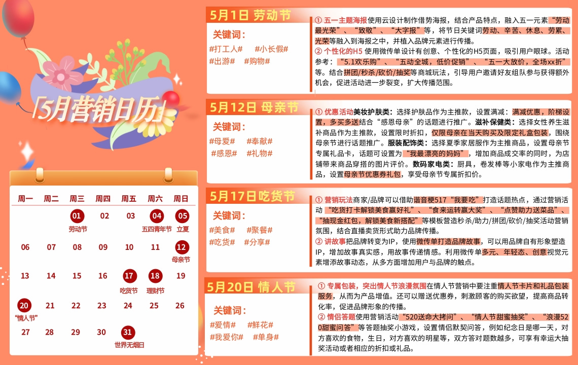 ① 優(yōu)惠活動:美妝護膚類:選擇護膚品作為主推款,設置滿減:滿減優(yōu)惠,階梯設置,多買多送結合“感恩母親”的話題進行推廣。滋補保健類:選擇女性養(yǎng)生補商品作為主推款,設置限時折扣,僅限母親在當天購買及限定禮盒包裝,圍繞母親節(jié)進行話題推廣。服裝配飾類:選擇夏季家居服作為主推商品,設置母親節(jié)專屬禮品卡,話題可設置為“我最漂亮的媽媽”,增加商品成交率的同時,為店鋪帶來商品穿搭的圖片評價。數(shù)碼家電類:廚具,卷發(fā)棒等小家電作為主推商品,設置母親節(jié)優(yōu)惠券禮包,享受母親節(jié)專屬折扣價。